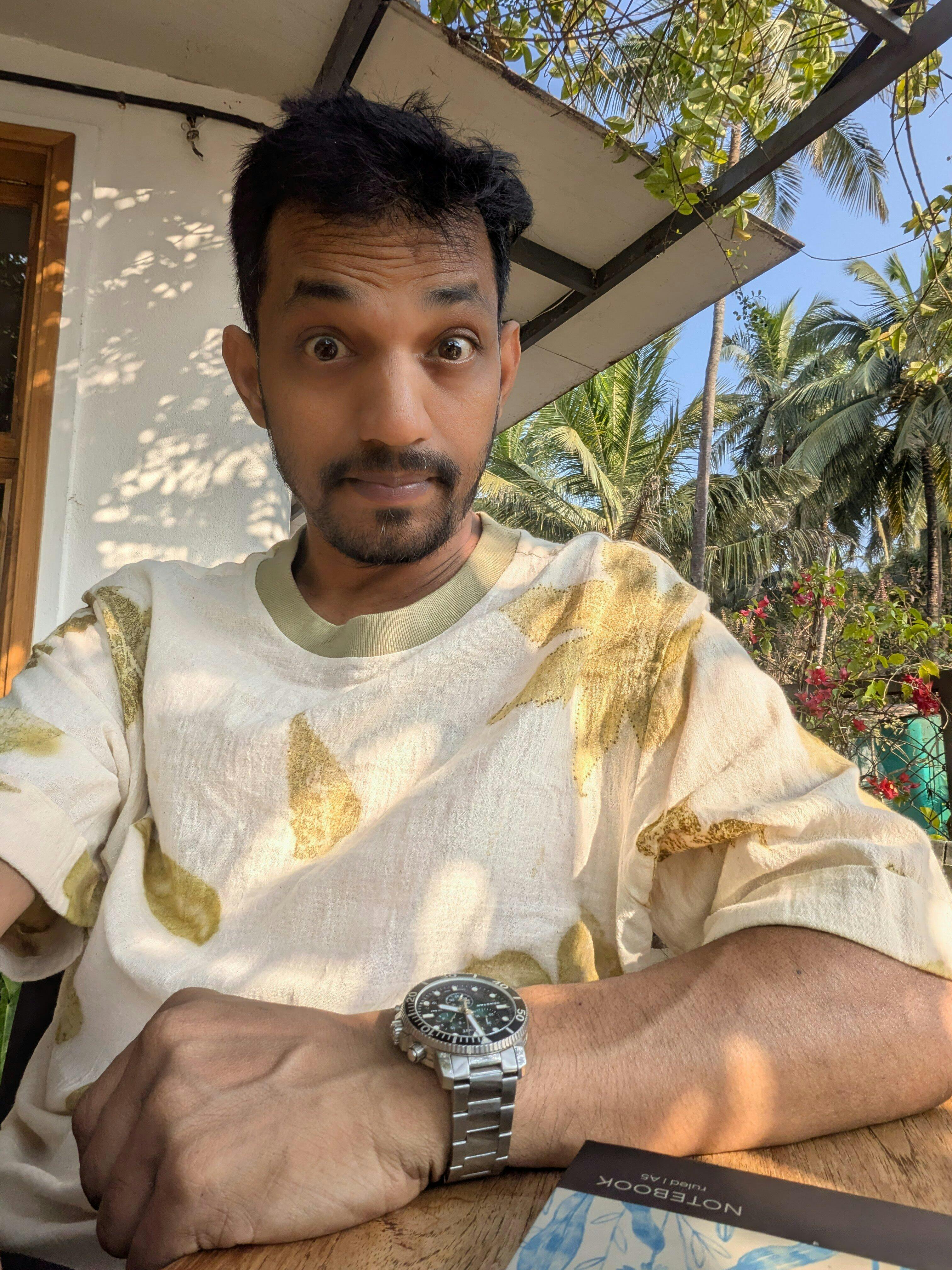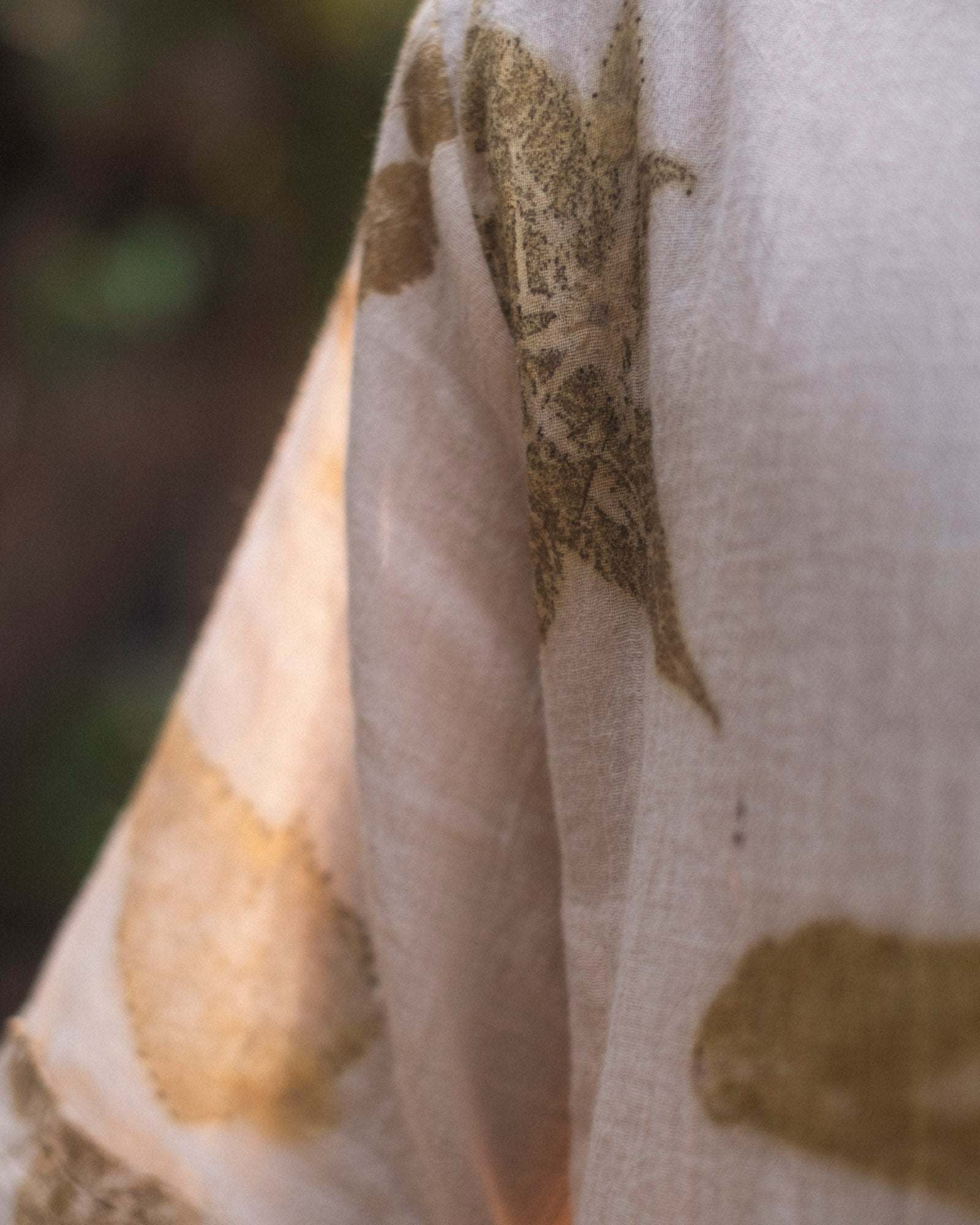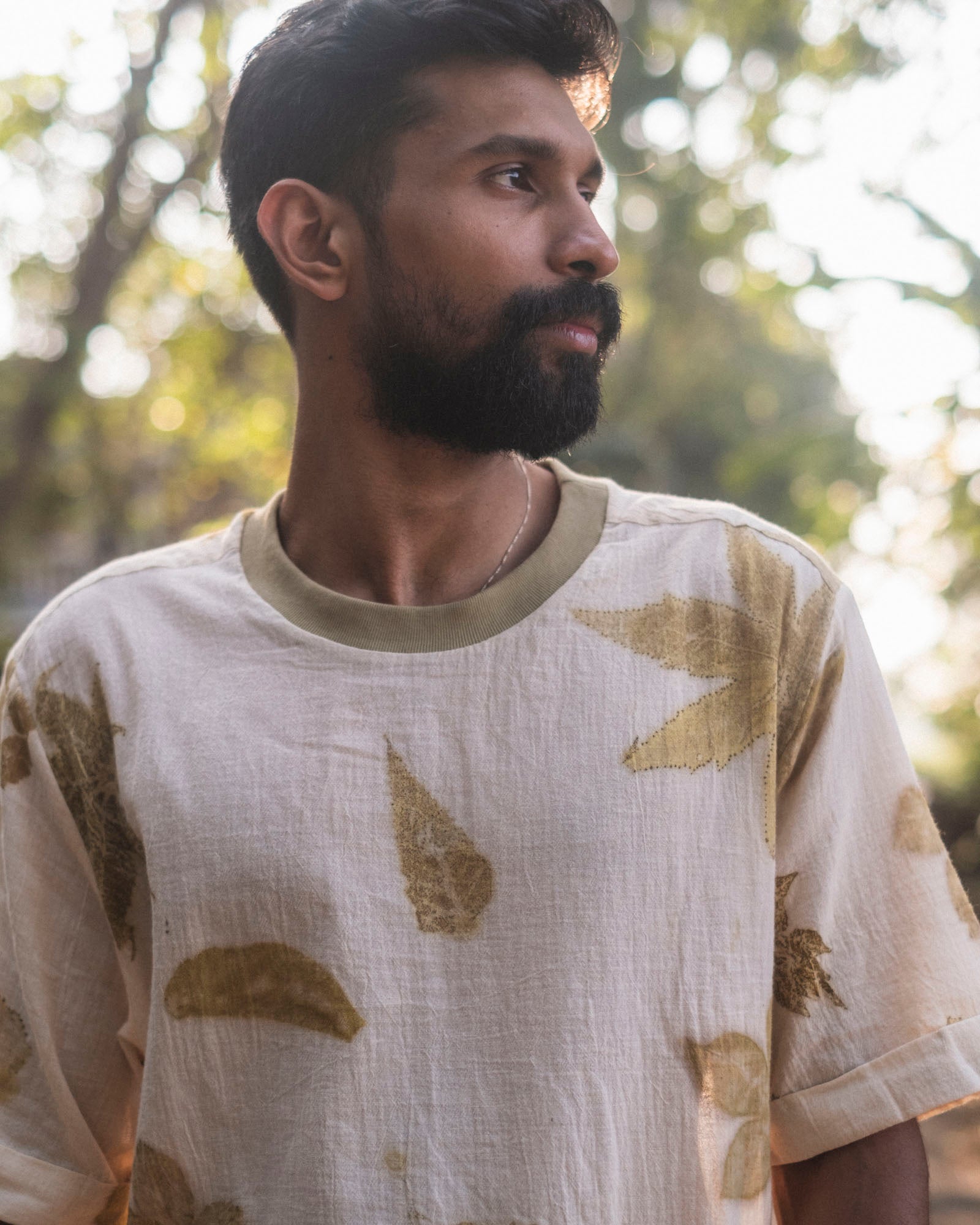 Eco printed cotton t-shirt in natural white, handcrafted in small batches using locally foraged leaves and a slow, chemical-free process.
