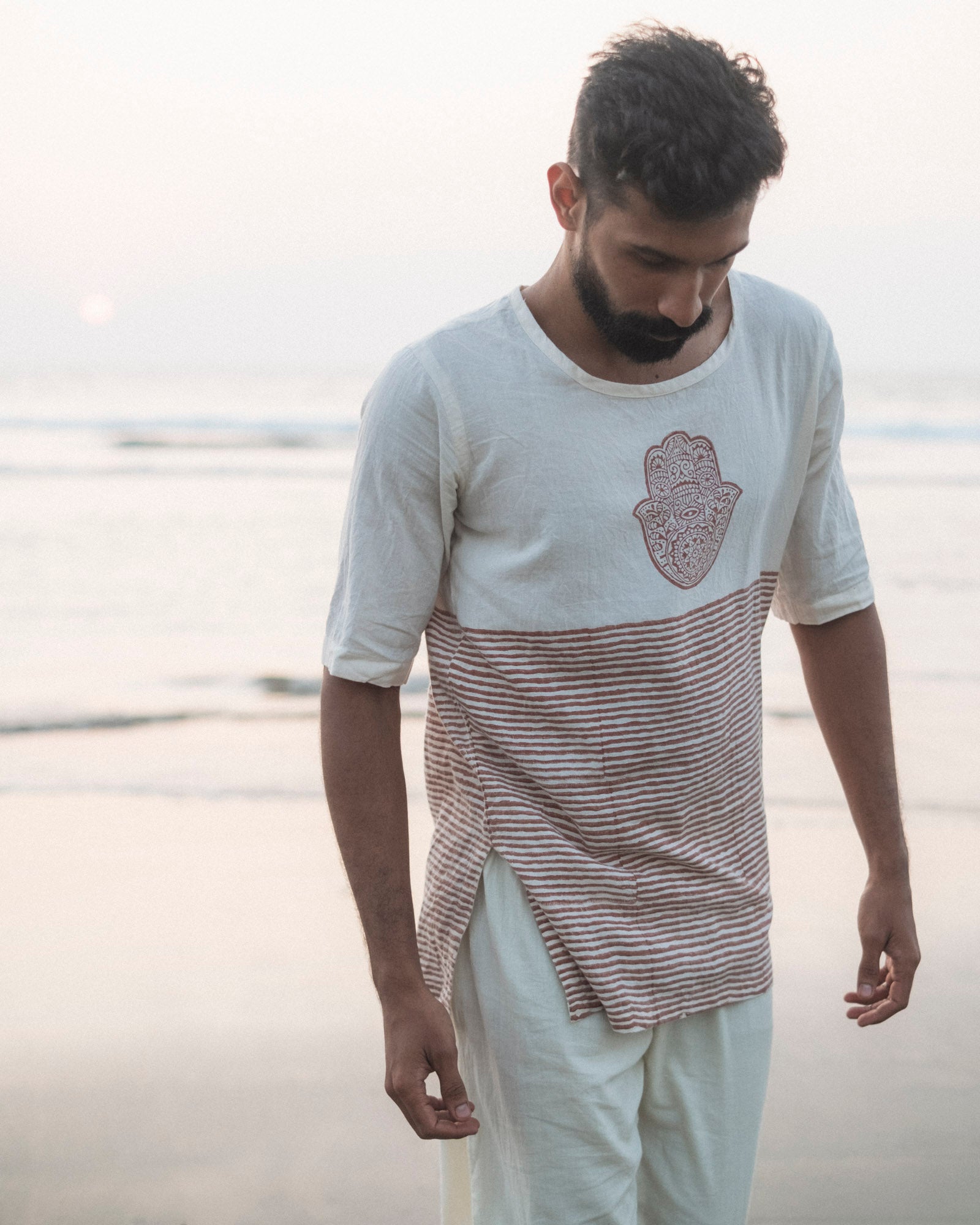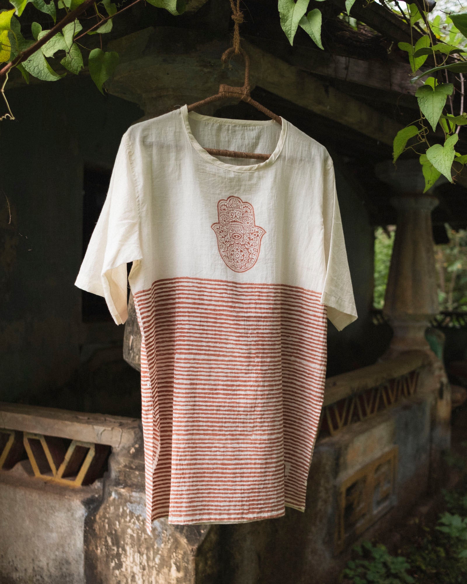 A breathable organic mulmul cotton kurta in rust, hand block printed with a traditional protective symbol that grounds the piece in quiet strength and everyday comfort.