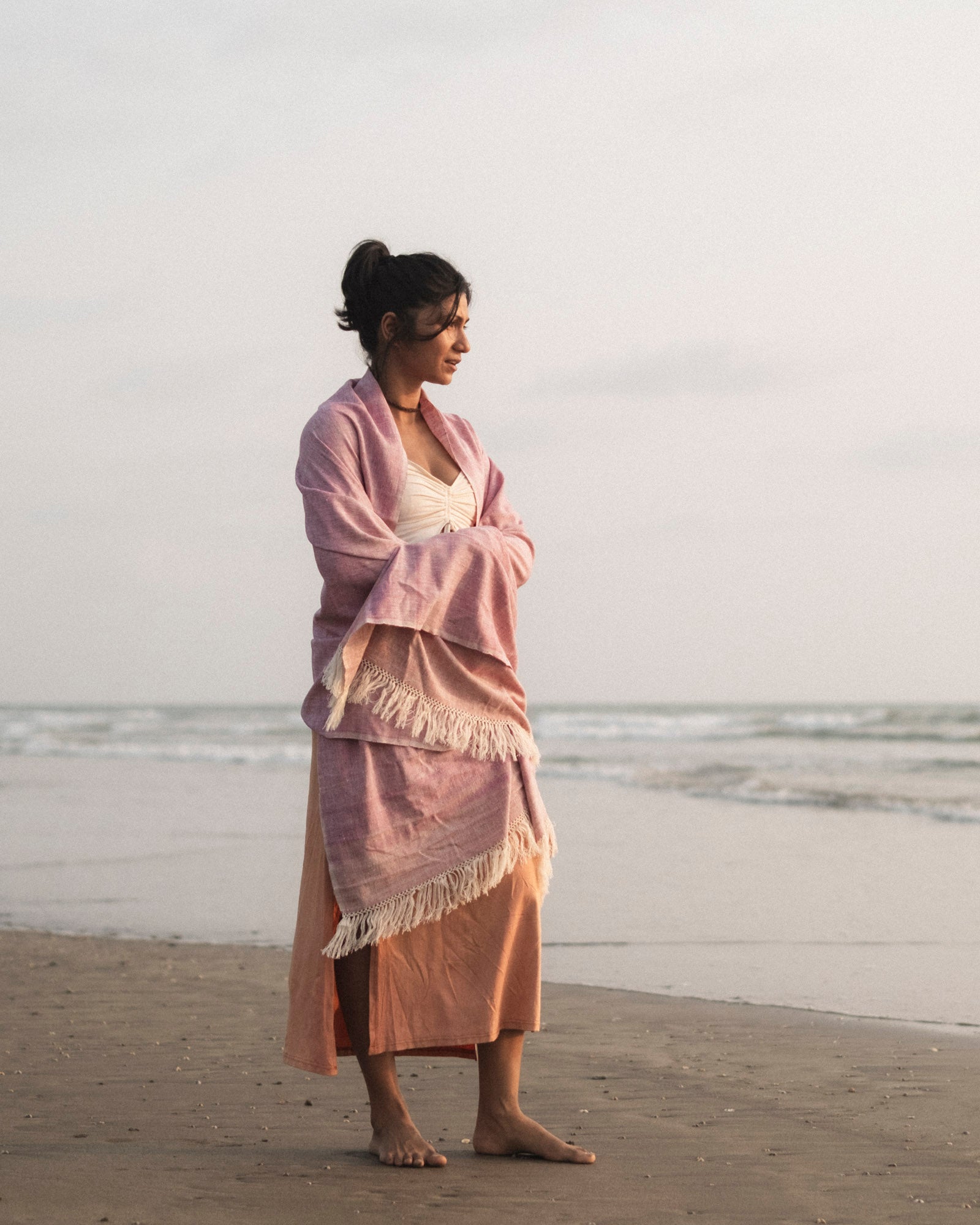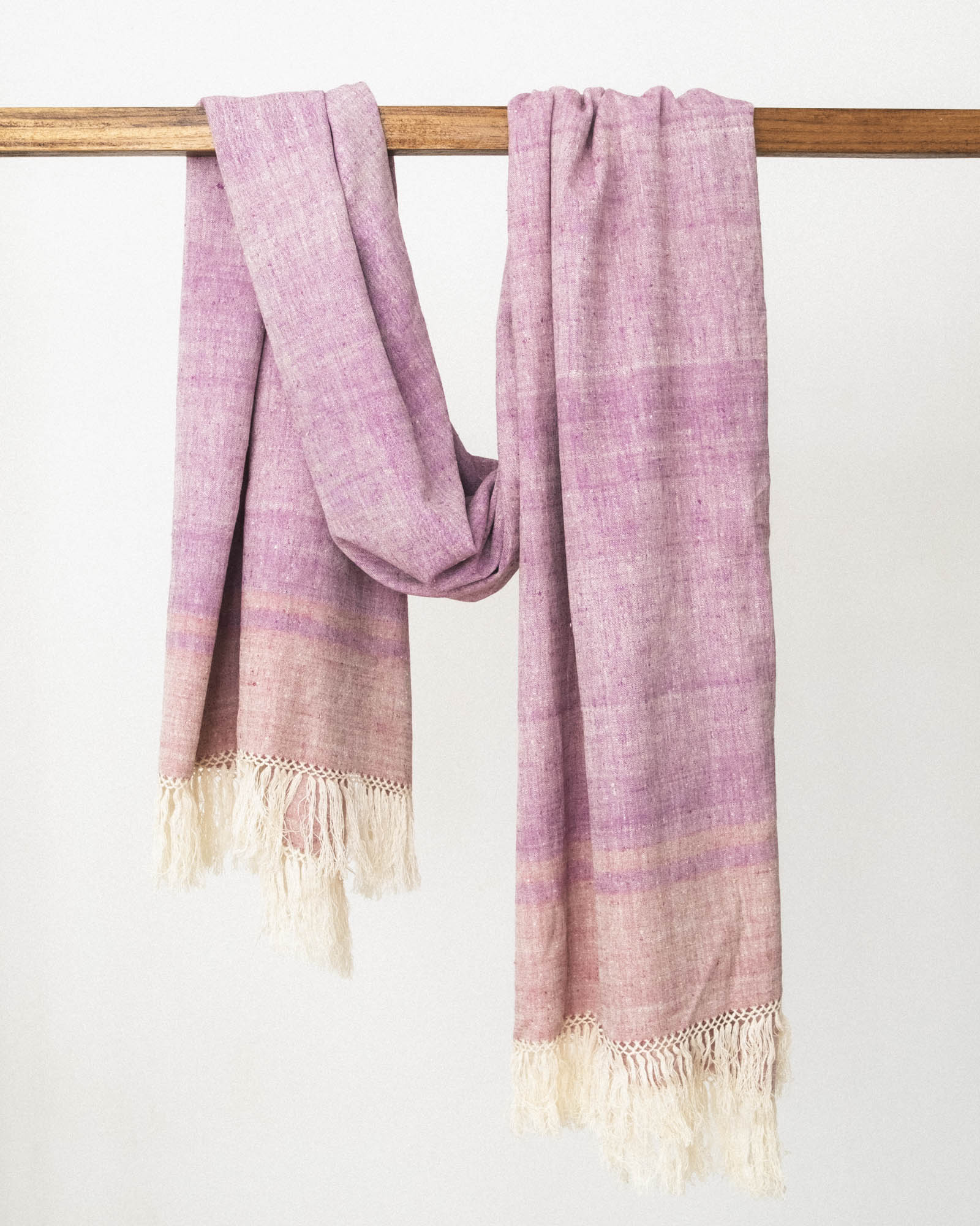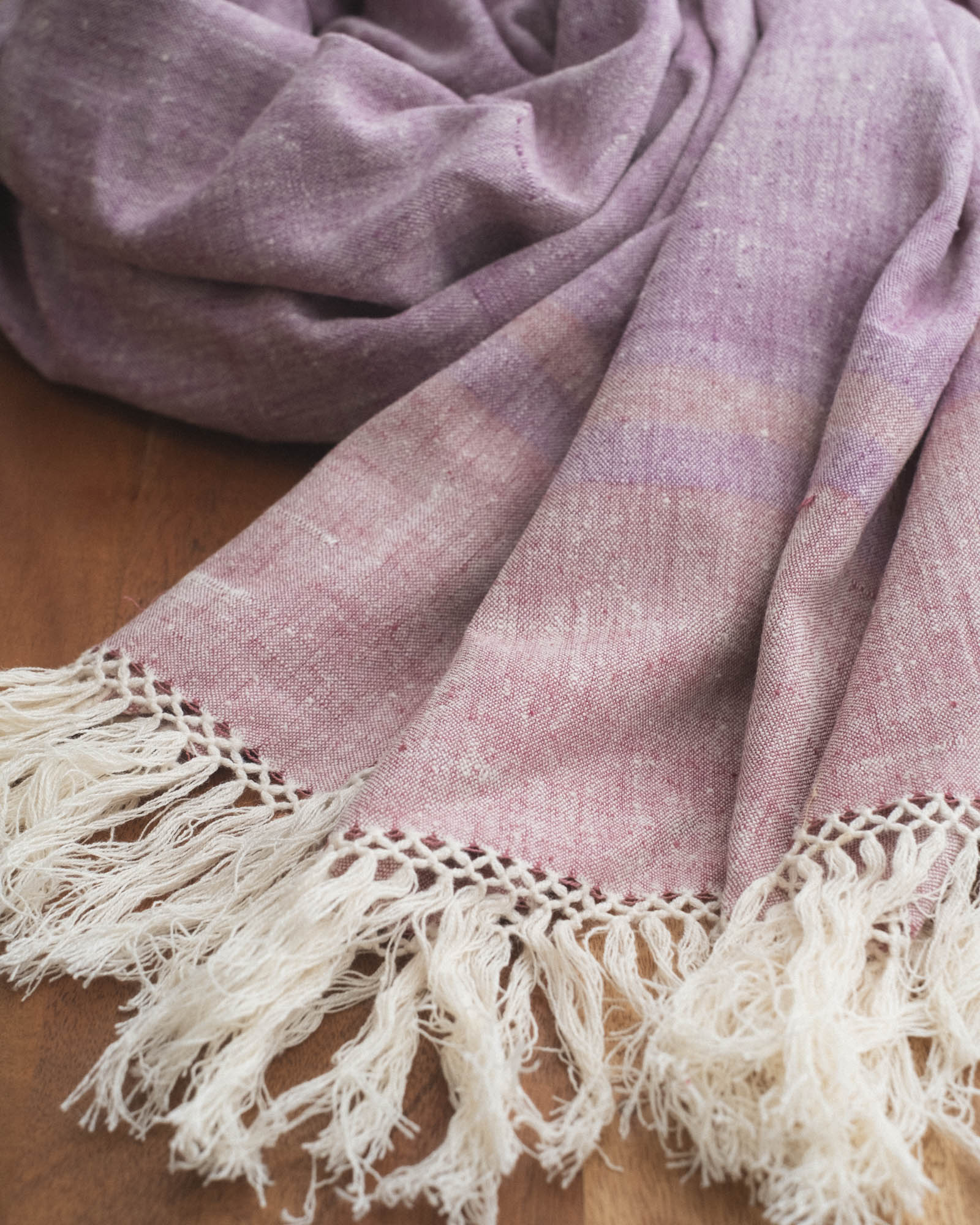 A handwoven Eri silk shawl in soft lilac and dusty mauve tones, crafted from cruelty-free peace silk for gentle, year-round layering as a shawl or scarf.