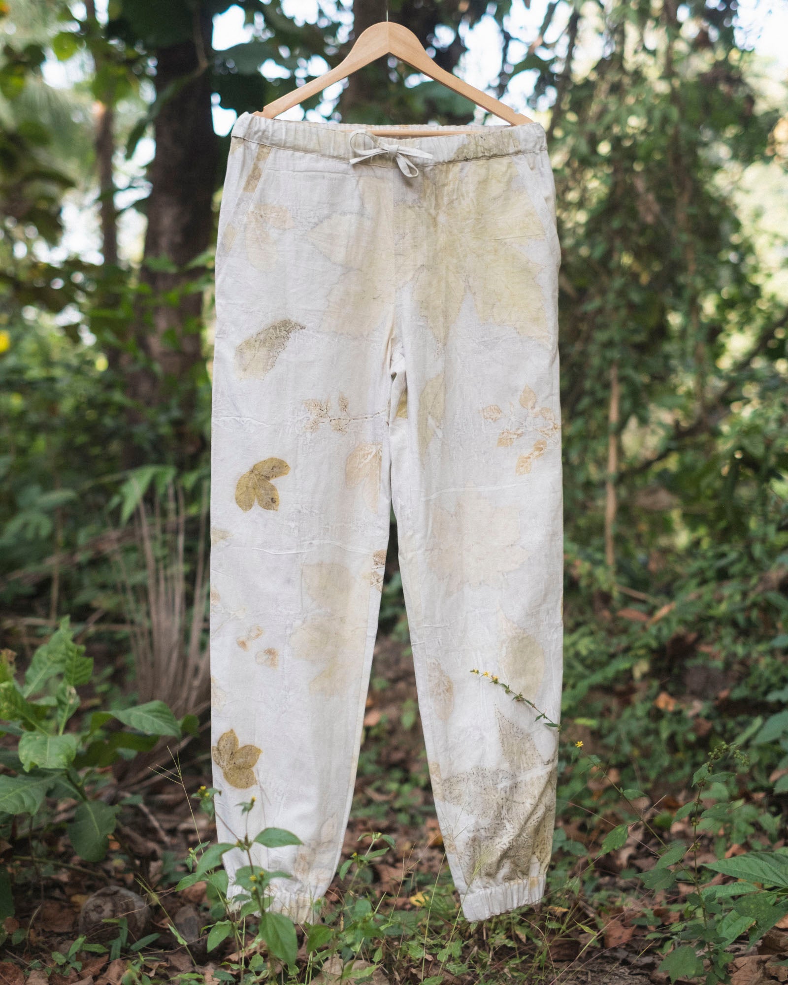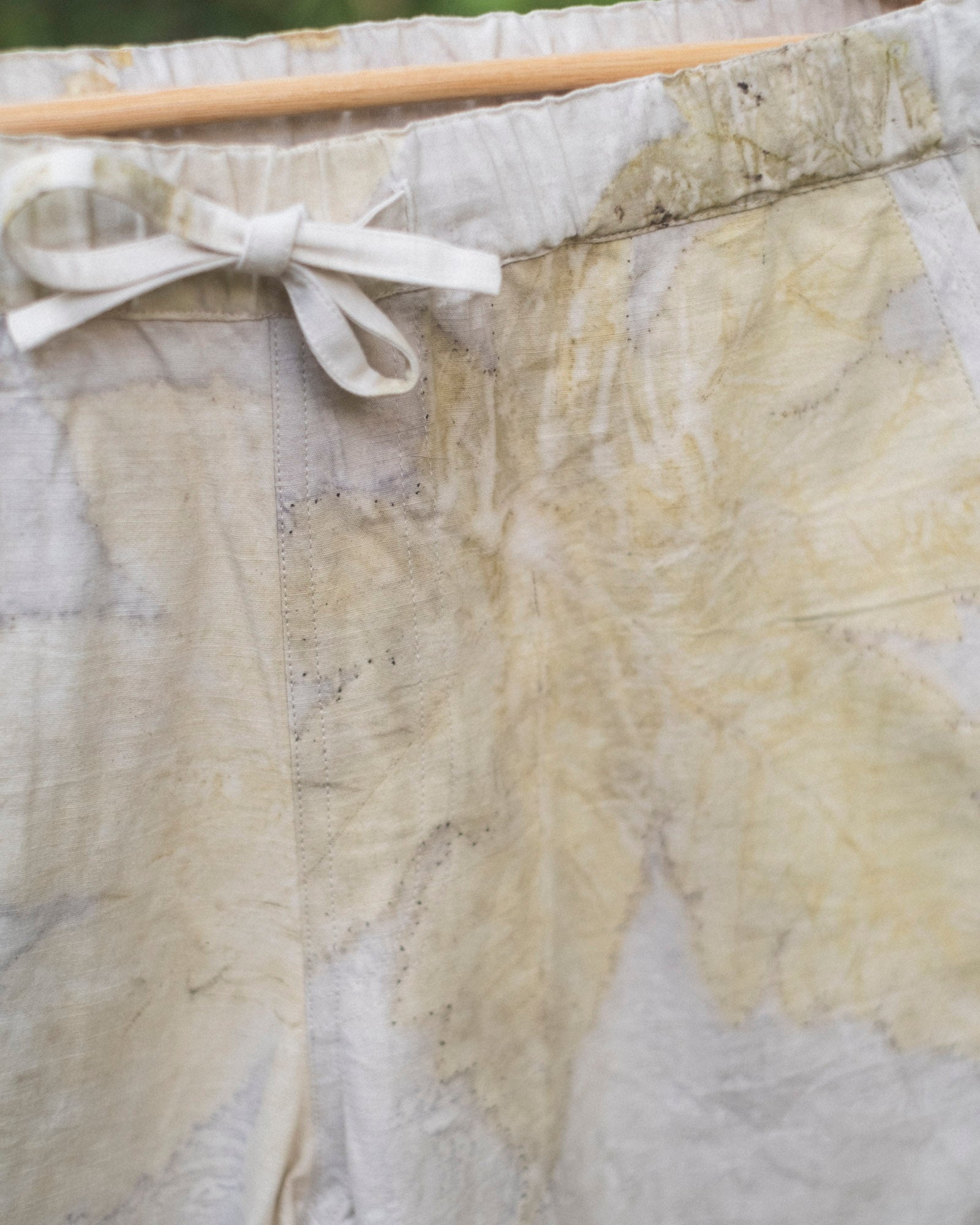 Please note: The product images may not be entirely representative of the product you will receive. Every pair of pants is eco printed by hand, which means the color scheme matches the images but the leaf layout will always be unique.