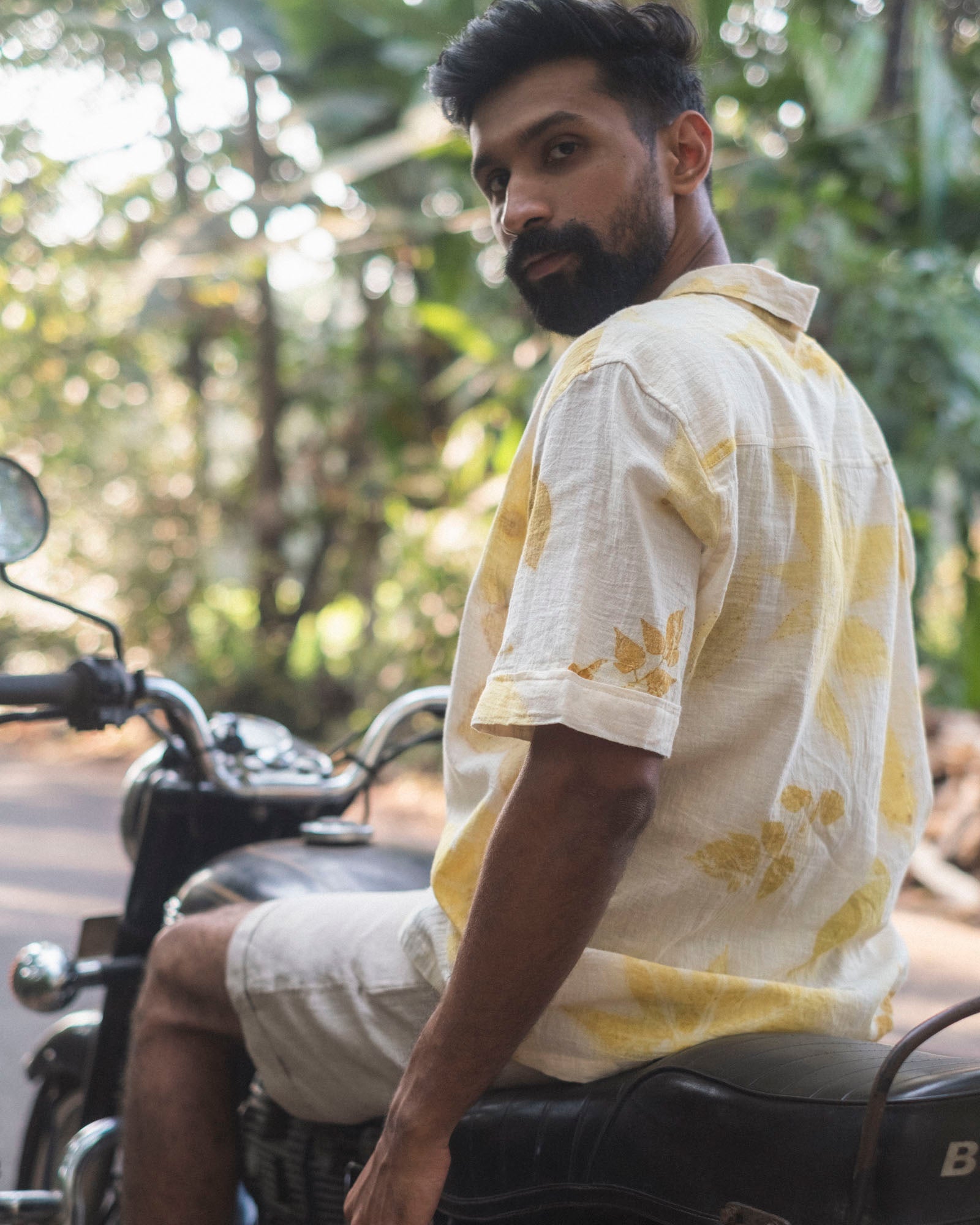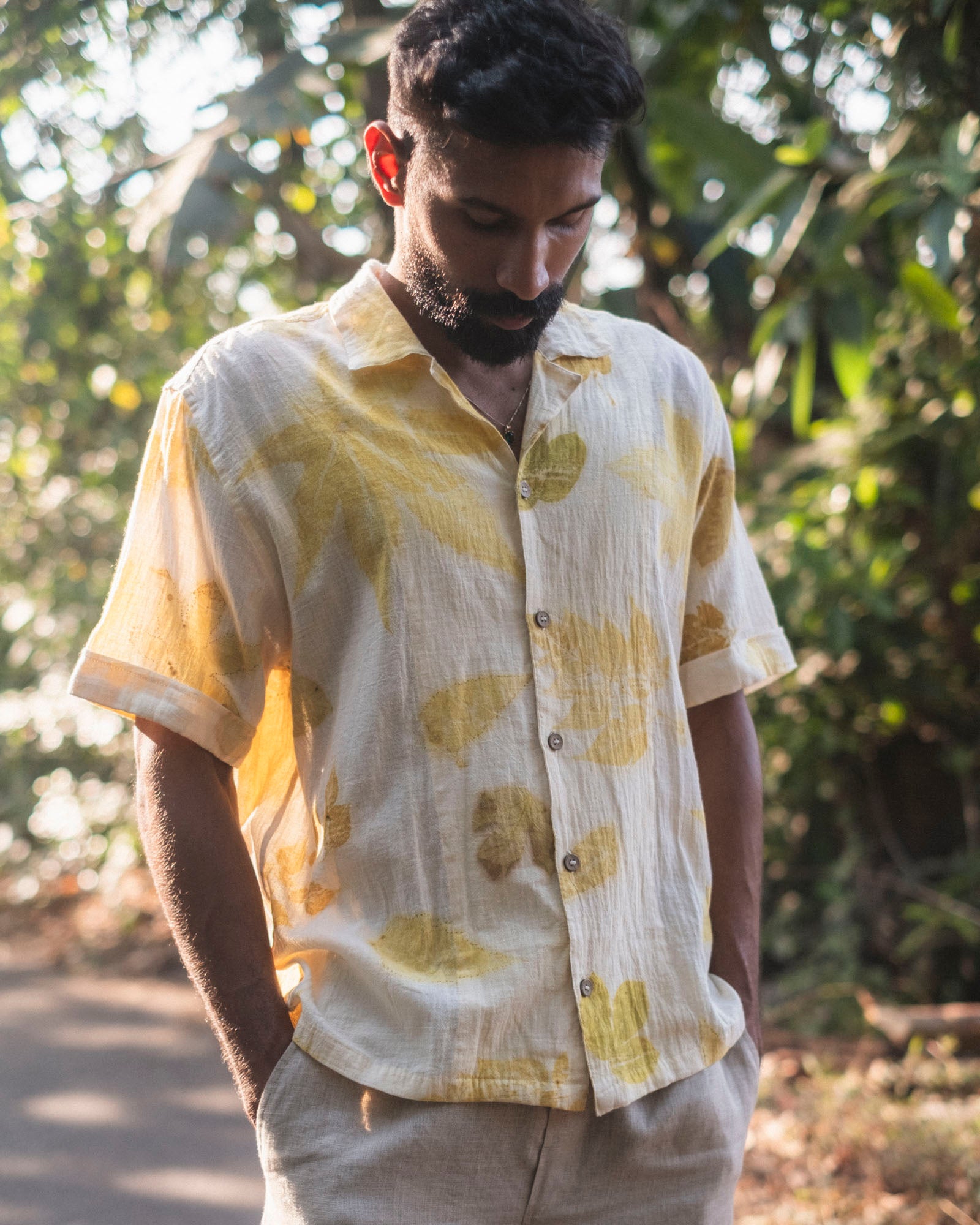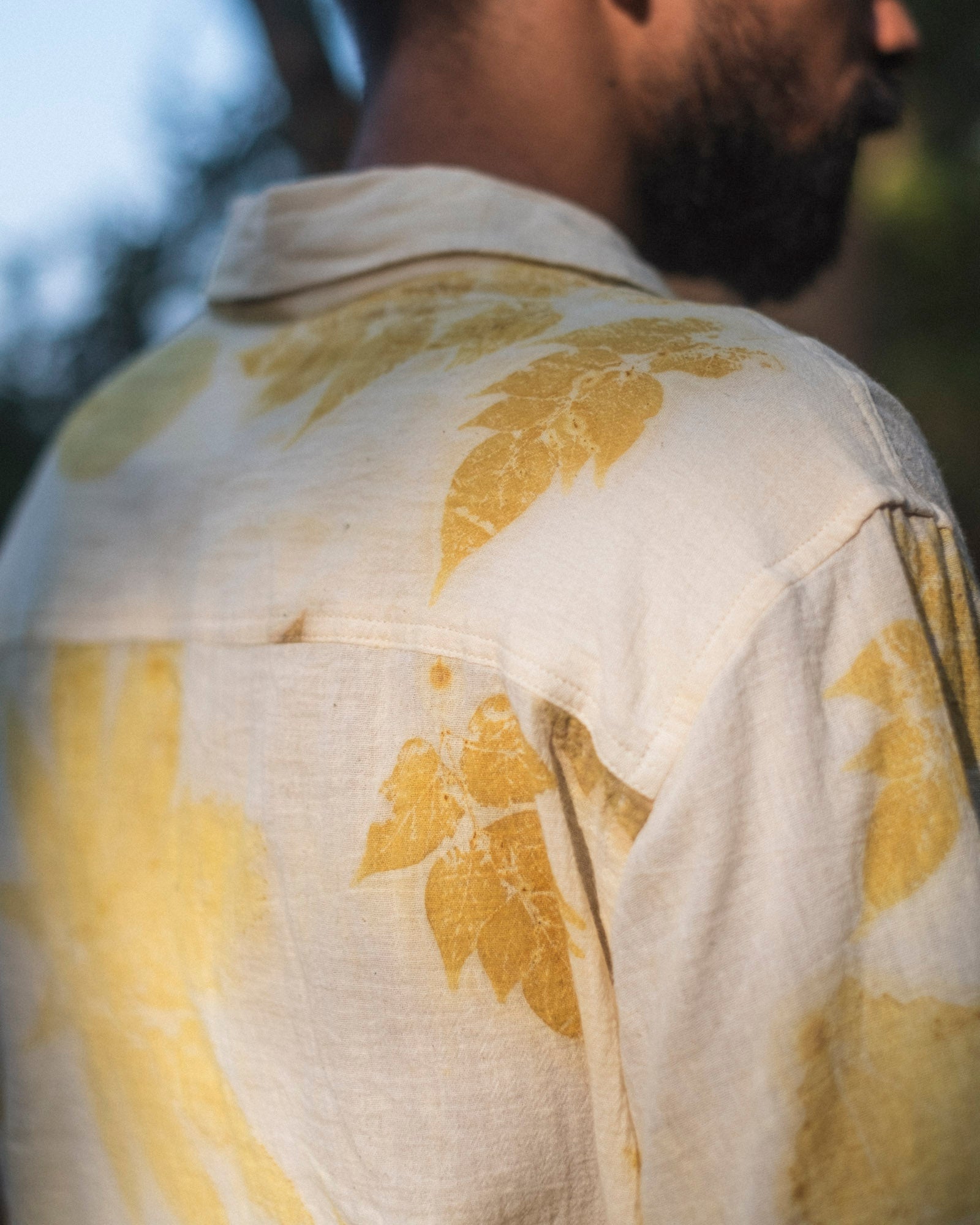 A soft, breathable eco printed cotton shirt in natural white, designed for everyday comfort and handcrafted in small batches using locally foraged leaves.