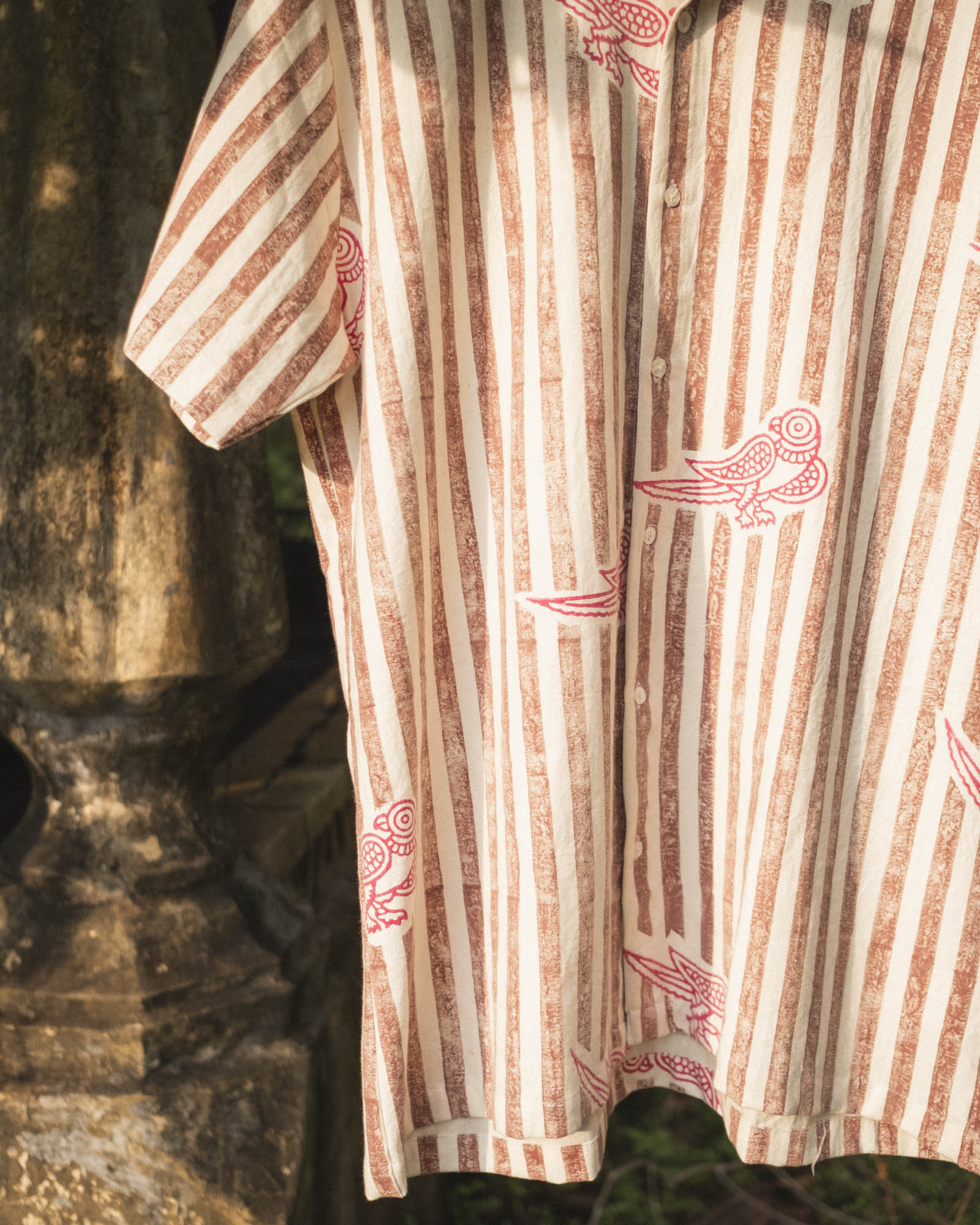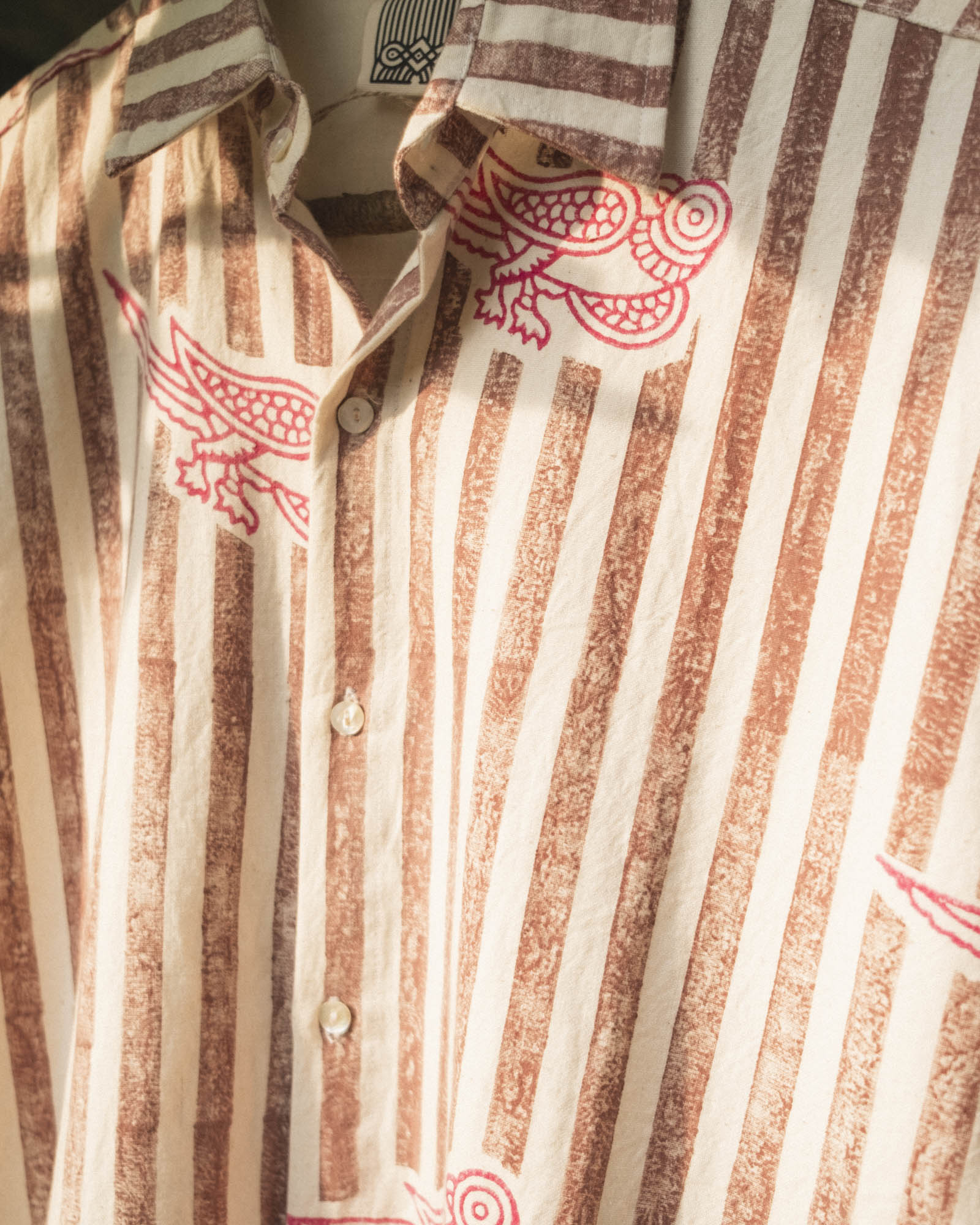 Soft lines and gentle warmth. This handwoven organic cotton shirt carries a calm clay toned stripe that feels grounded and effortless. Made from lightweight cotton and dyed with eco-conscious GOTS certified dyes, it is relaxed, breathable, and crafted for unhurried days.
