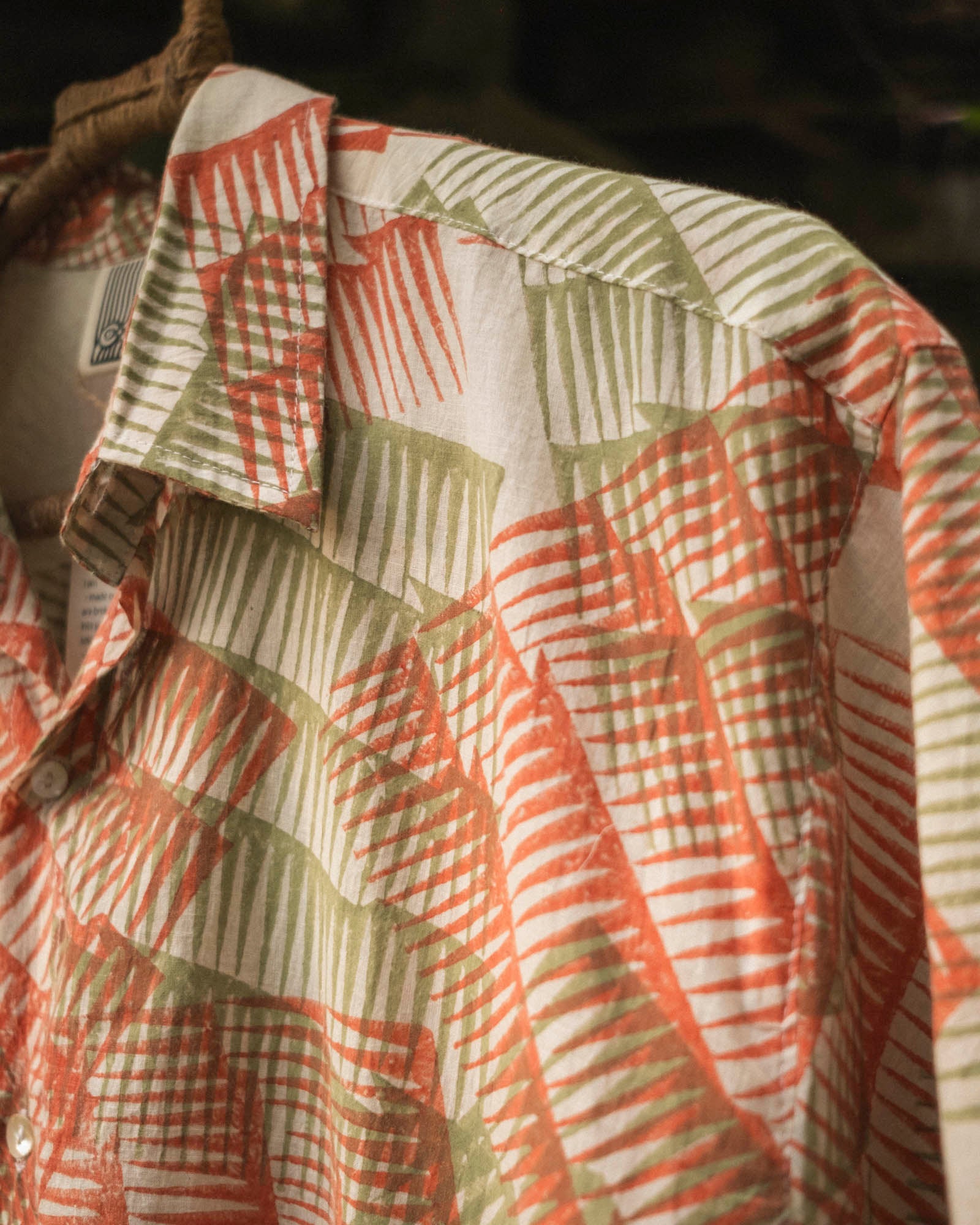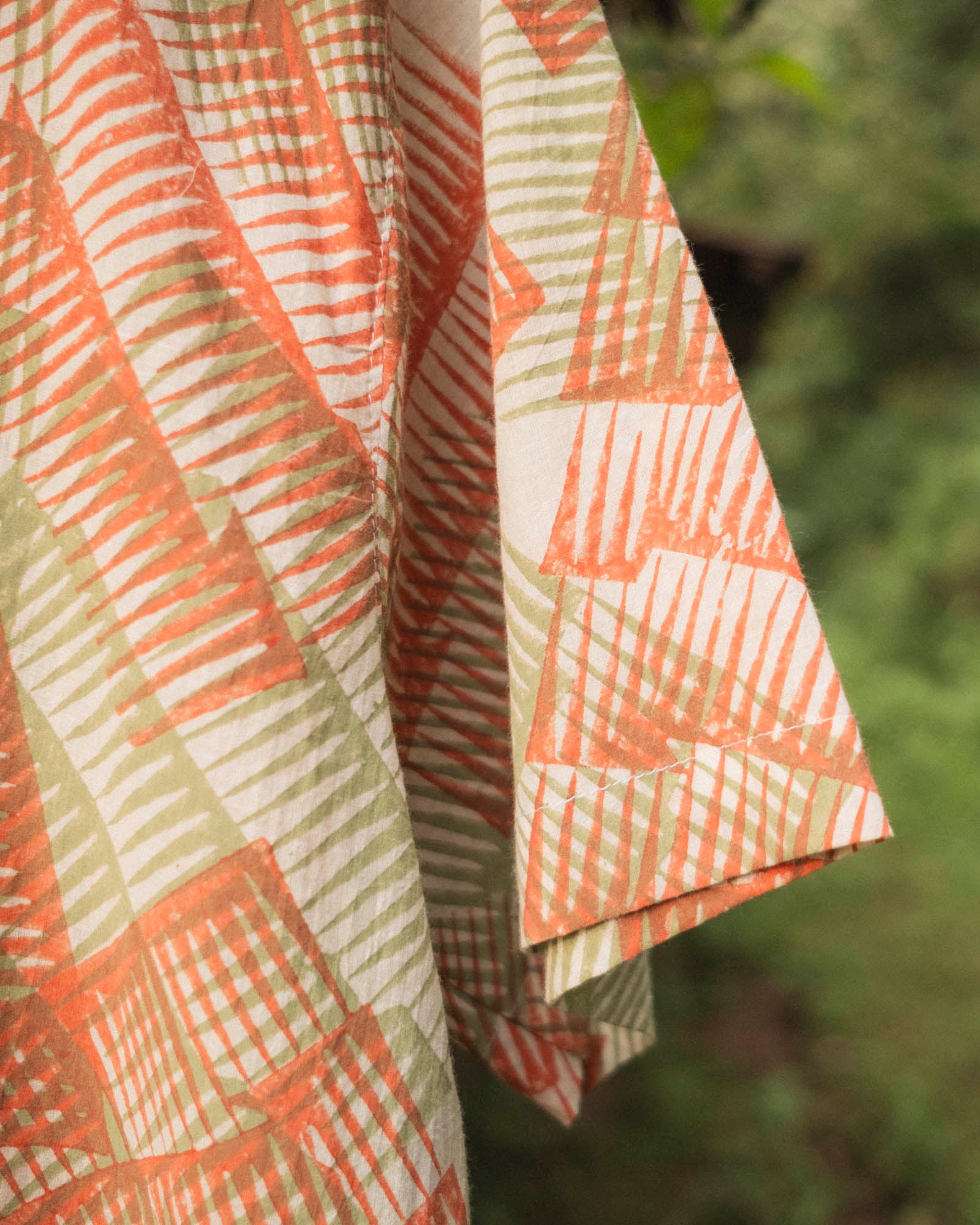 Sunlight through palm leaves, captured in cloth. Warm peach tones and soft green lines meet in balance — hand block printed on organic cotton for days that feel grounded and alive.