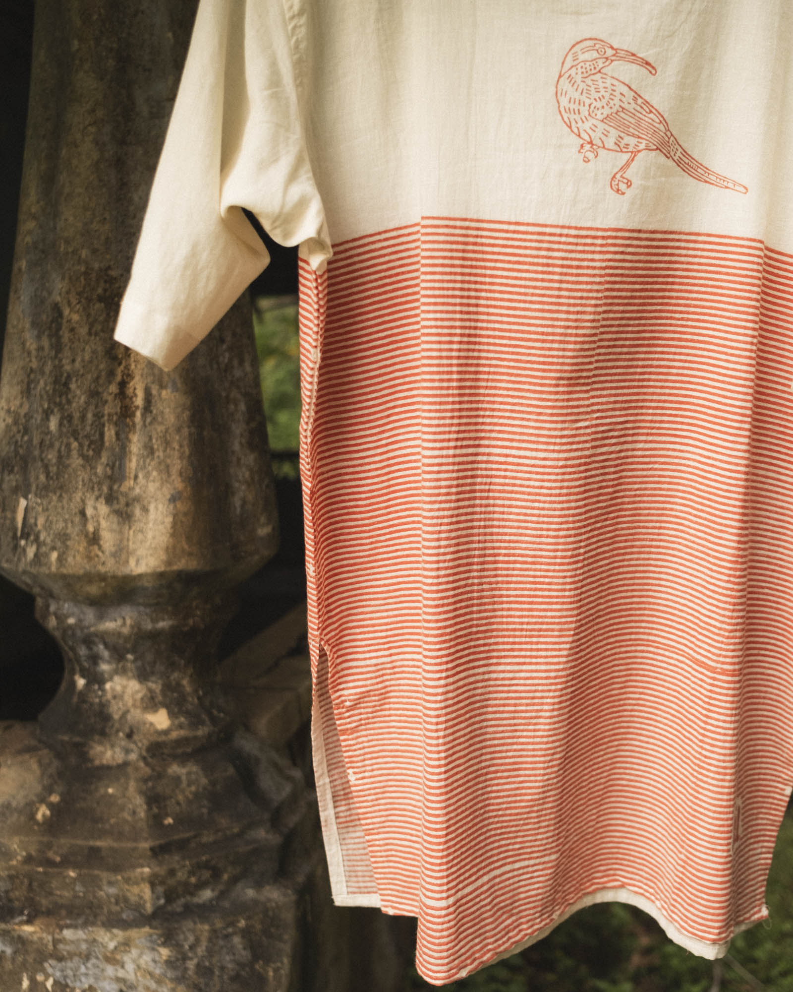 For those who move gently through the world. Hand block printed with a bird motif symbolizing travel and return, this peach kurta captures the calm rhythm of slow journeys. Cool, breathable, and designed for ease.