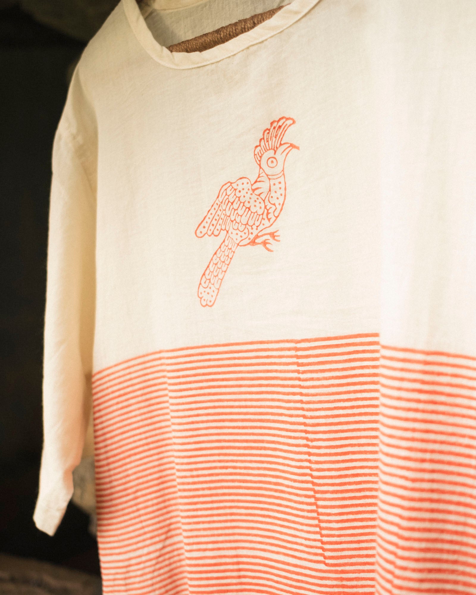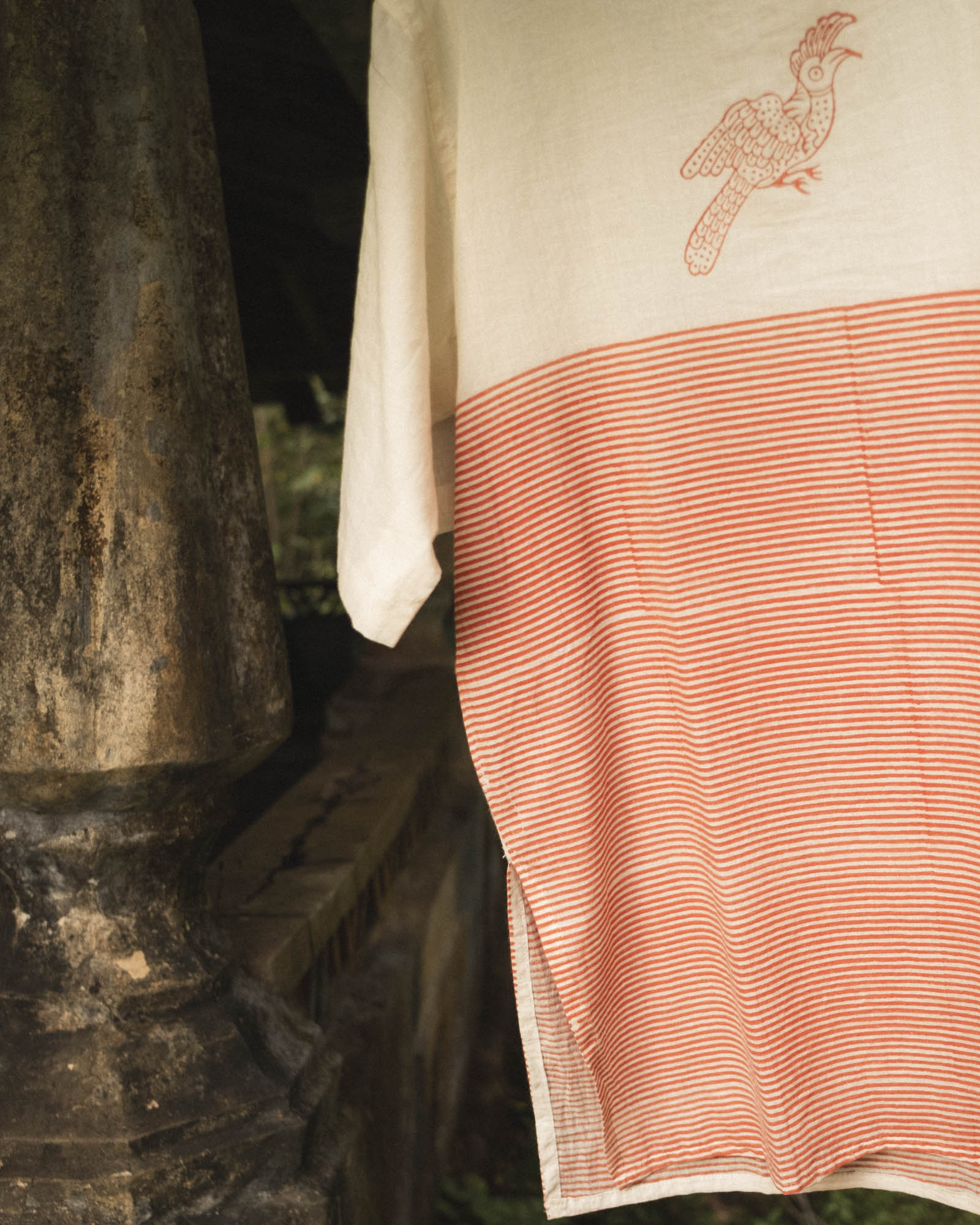 Quietly bold, softly free. Hand block printed with a bird in flight, this peach kurta carries a quiet energy and ease. Light, breathable, and crafted from organic mulmul cotton for days that move at their own rhythm.