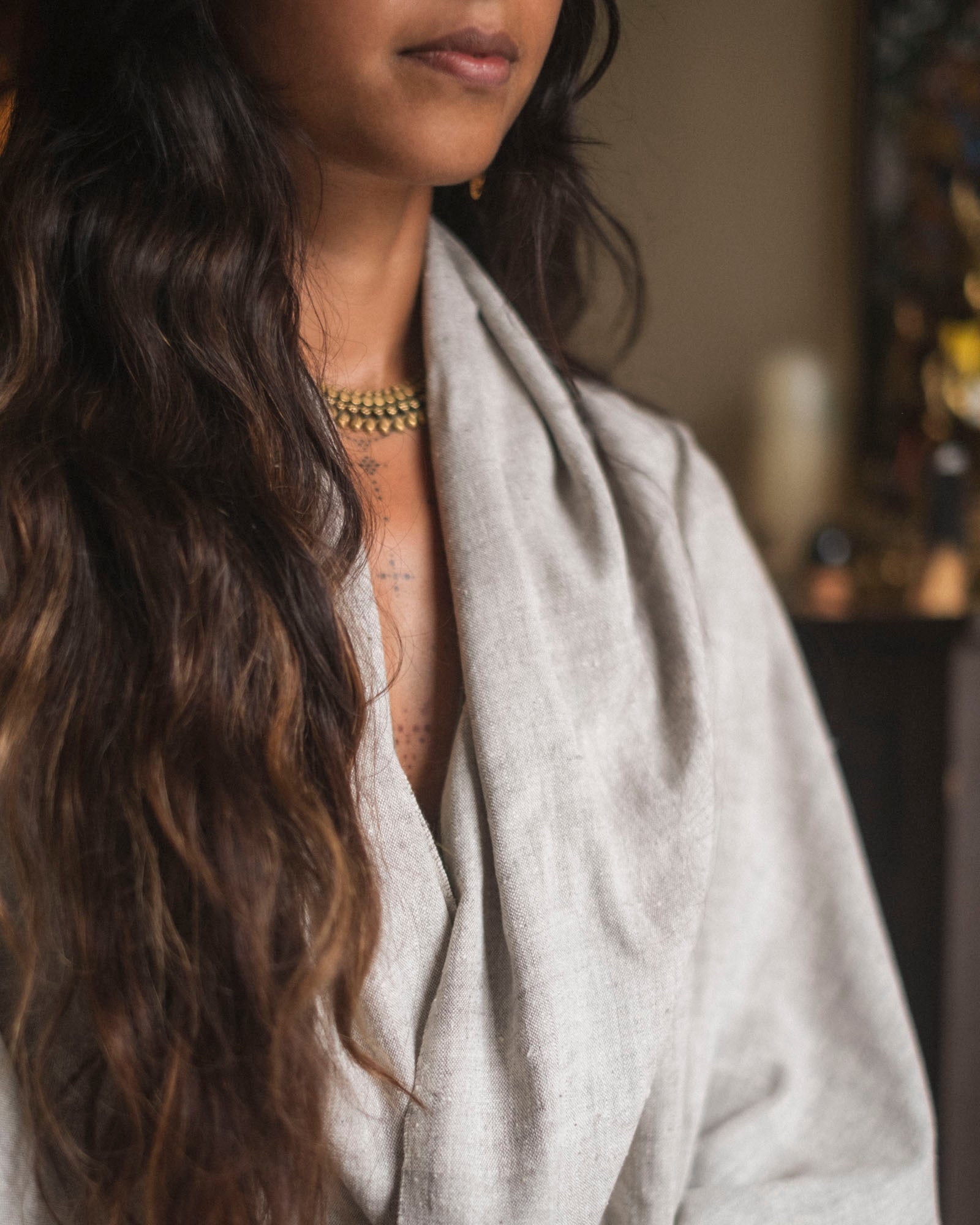 Each Eri silk shawl is handwoven and naturally dyed using cruelty-free peace silk. Its generous size allows it to be styled as a wrap or worn as a scarf for lighter layering. Small variations in color and texture are part of what makes each piece truly unique. Your shawl may differ slightly from the photos shown. This is a hallmark of artisan-made work.