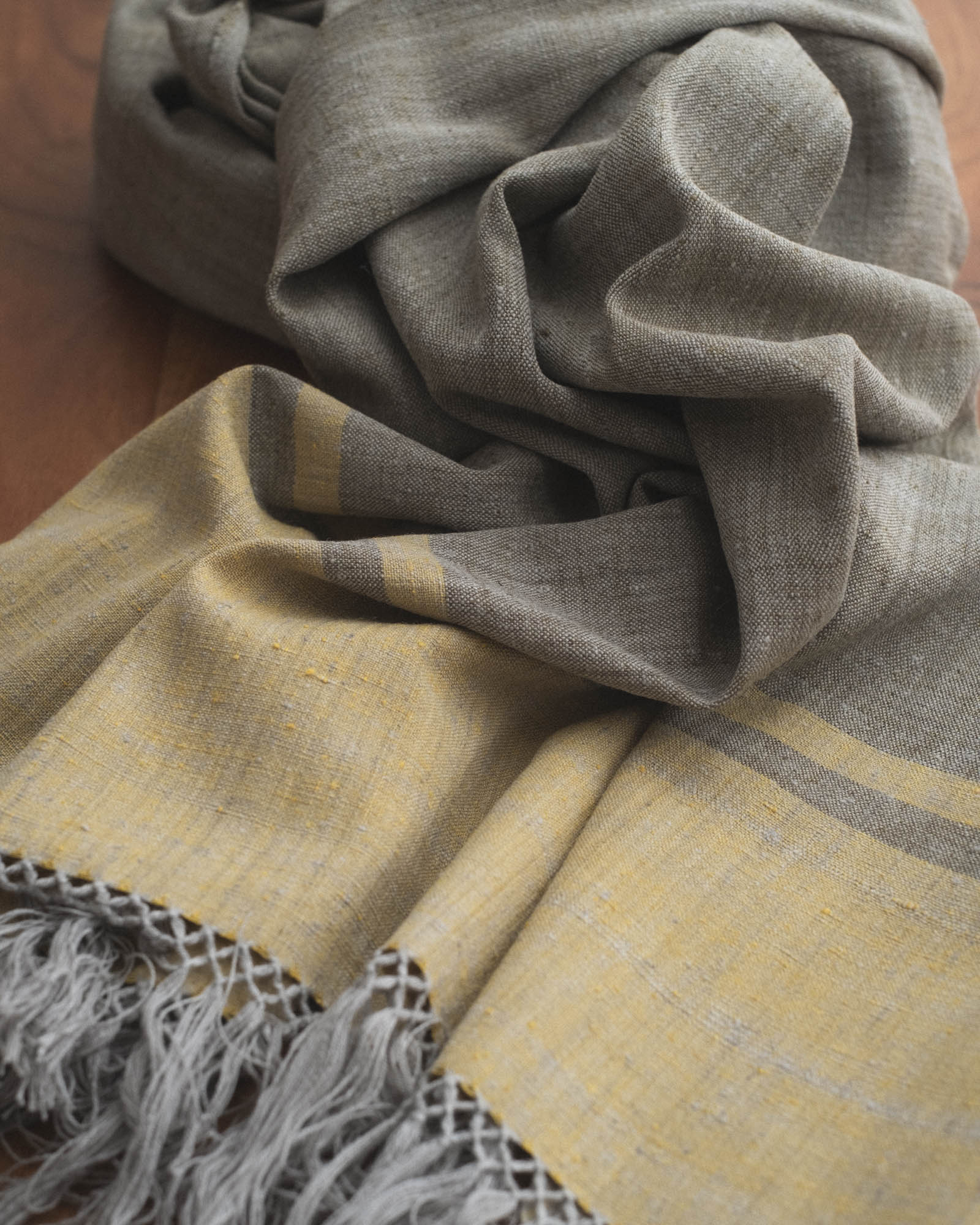 Worn by weather and full of quiet depth. Tundra is inspired by vast, open landscapes where color meets shadow. Olive greens, muted gold, and cool grey come together in a shawl that feels rooted and refined. Natural, ethical, and timeless.